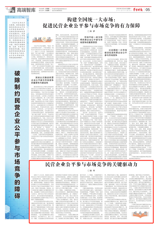 党的十八大以来,我国在支持民营企业公平参与市场竞争方面出台了一系列政策文件,实施市场准入负面清单制度,着力解决民营企业融资难、融资贵等难题,加强知识产权保护和建立公平竞争审查制度等,为民营企业公平参与市场竞争提供了有力支持,取得了明显效果。特别是,近年来我们着力破除行业垄断和地方垄断,有效激发了民营企业的市场活力与竞争力,提升其公平参与市场竞争的水平,更为实现经济高质量发展、优化资源配置以及维护市场公平正义提供了重要制度保障。