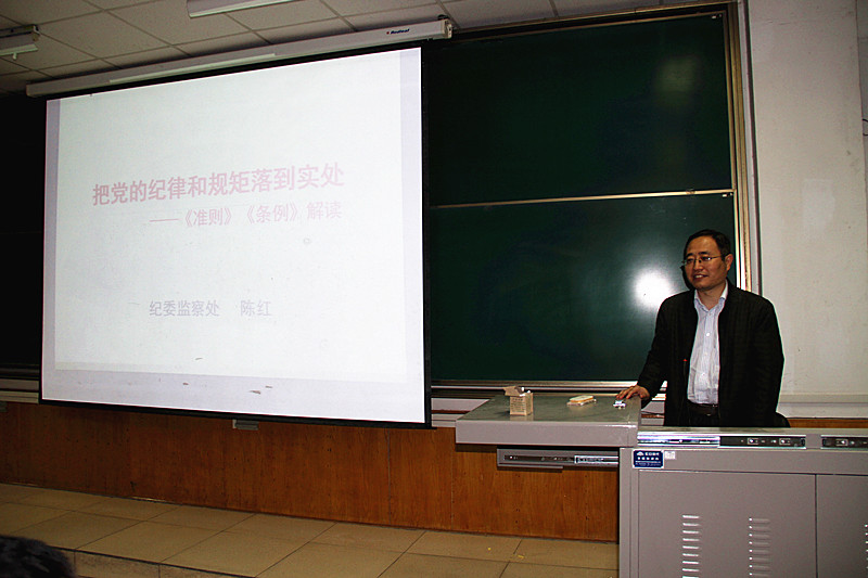 25日下午,校纪委副书记、监察处处长陈红老师应学院邀请为全院教工党员与学生党员做了“两学一做”辅导报告——《把党的纪律和规矩落到实处》。院党委书记宋丽颖主持会议。