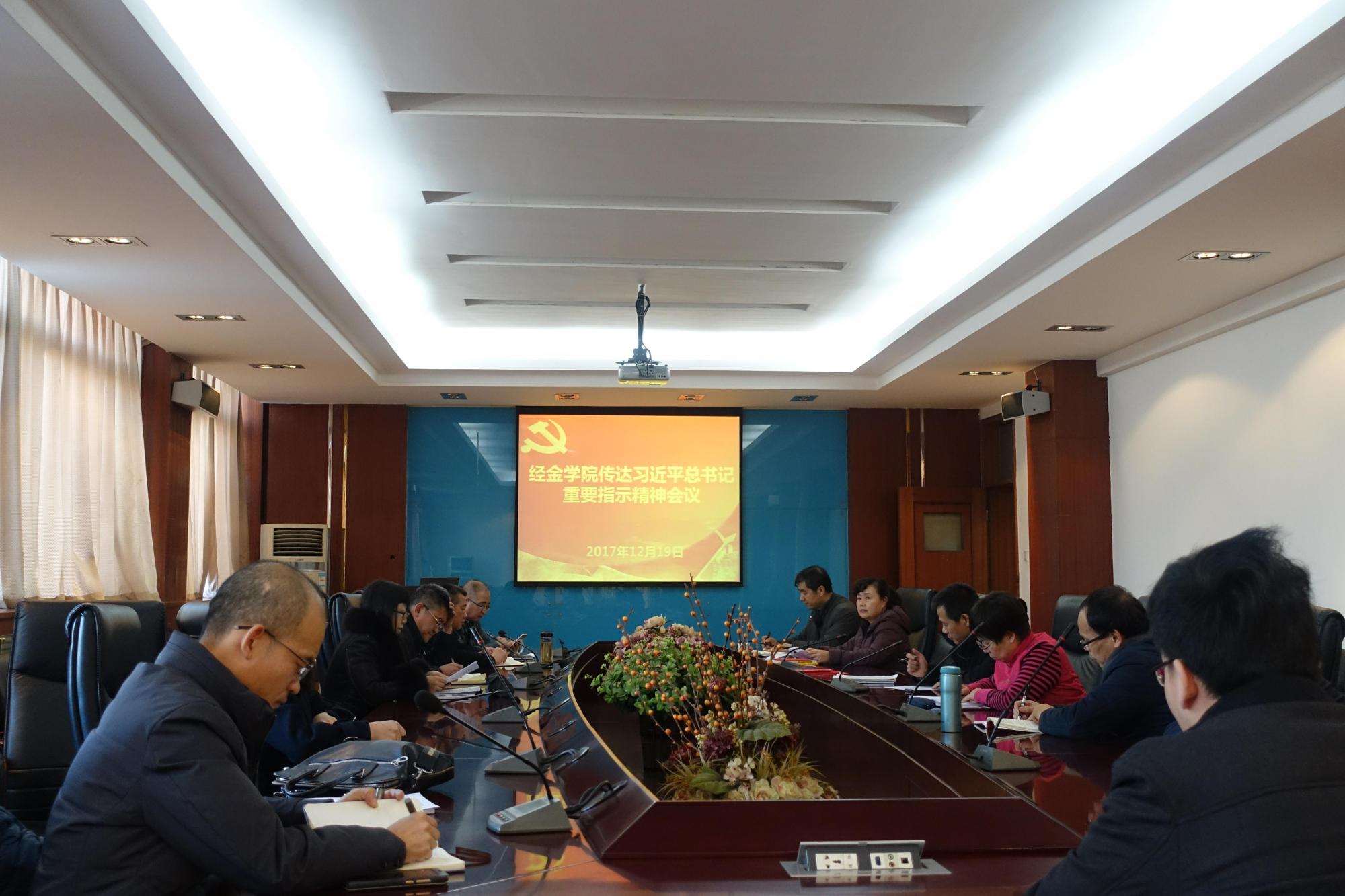 12月19日下午,经金学院召开会议传达习近平总书记重要指示精神。学院领导班子成员、院党委委员、教工支部书记以及青年教师代表参加了会议。会议由院党委书记宋丽颖主持。