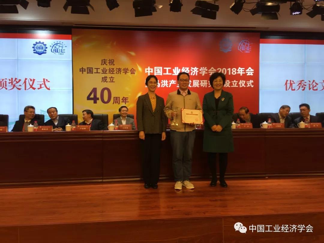经金学院产业经济学专业博士生徐远华的论文《中国工业加速创新的新机制——基于人力资本分工与协同的研究视角》荣获唯一的一等奖。江小涓研究员和史丹研究员共同为徐远华博士颁发获奖证书和奖杯,并合影留念。