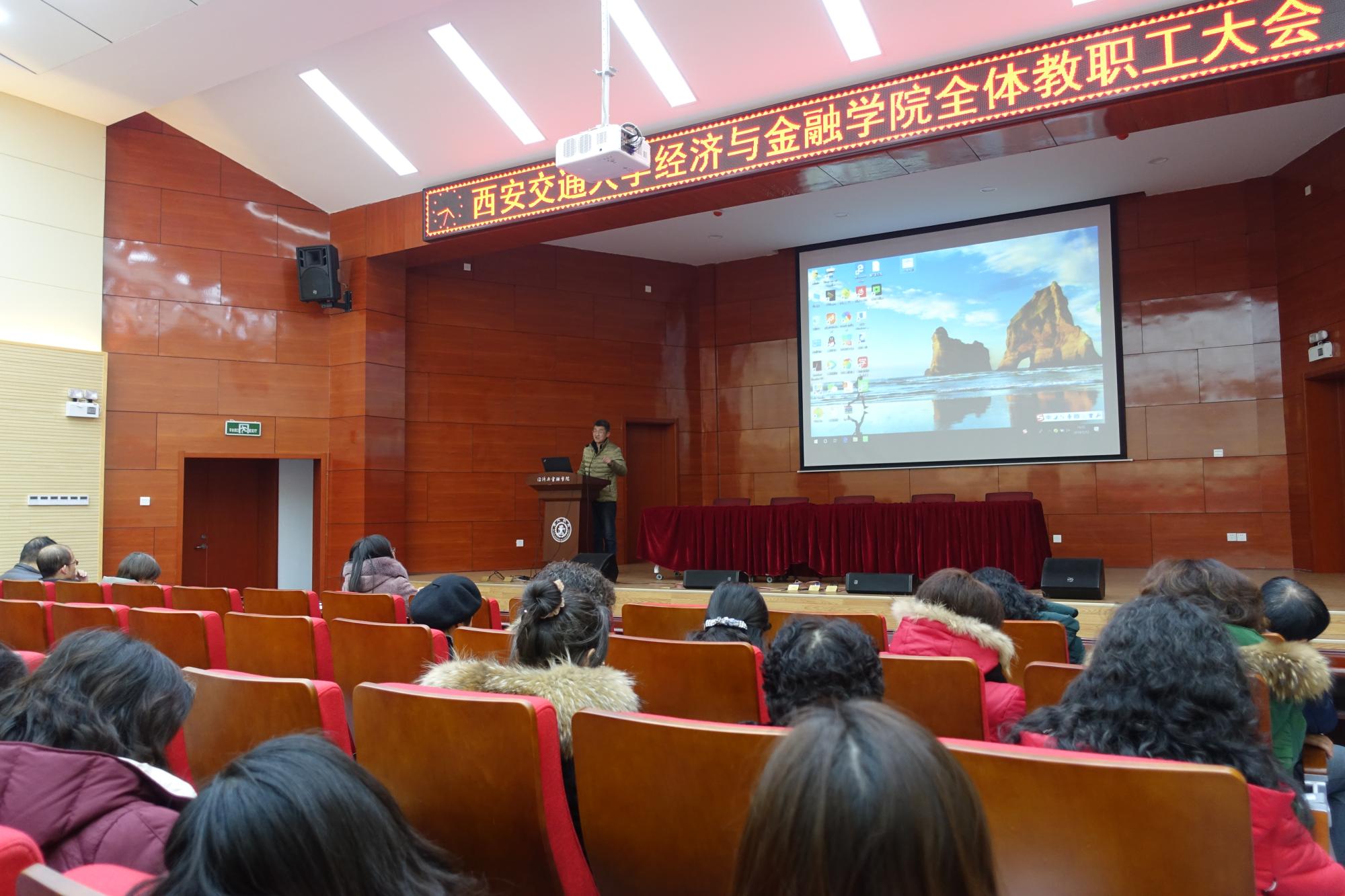 1月12日下午,经金学院在财经校区东配三报告厅召开全院教职工大会,传达学习学校寒假工作会议精神,布置新一年的工作,全体教职工出席大会。会议由党委副书记周建伦主持。
