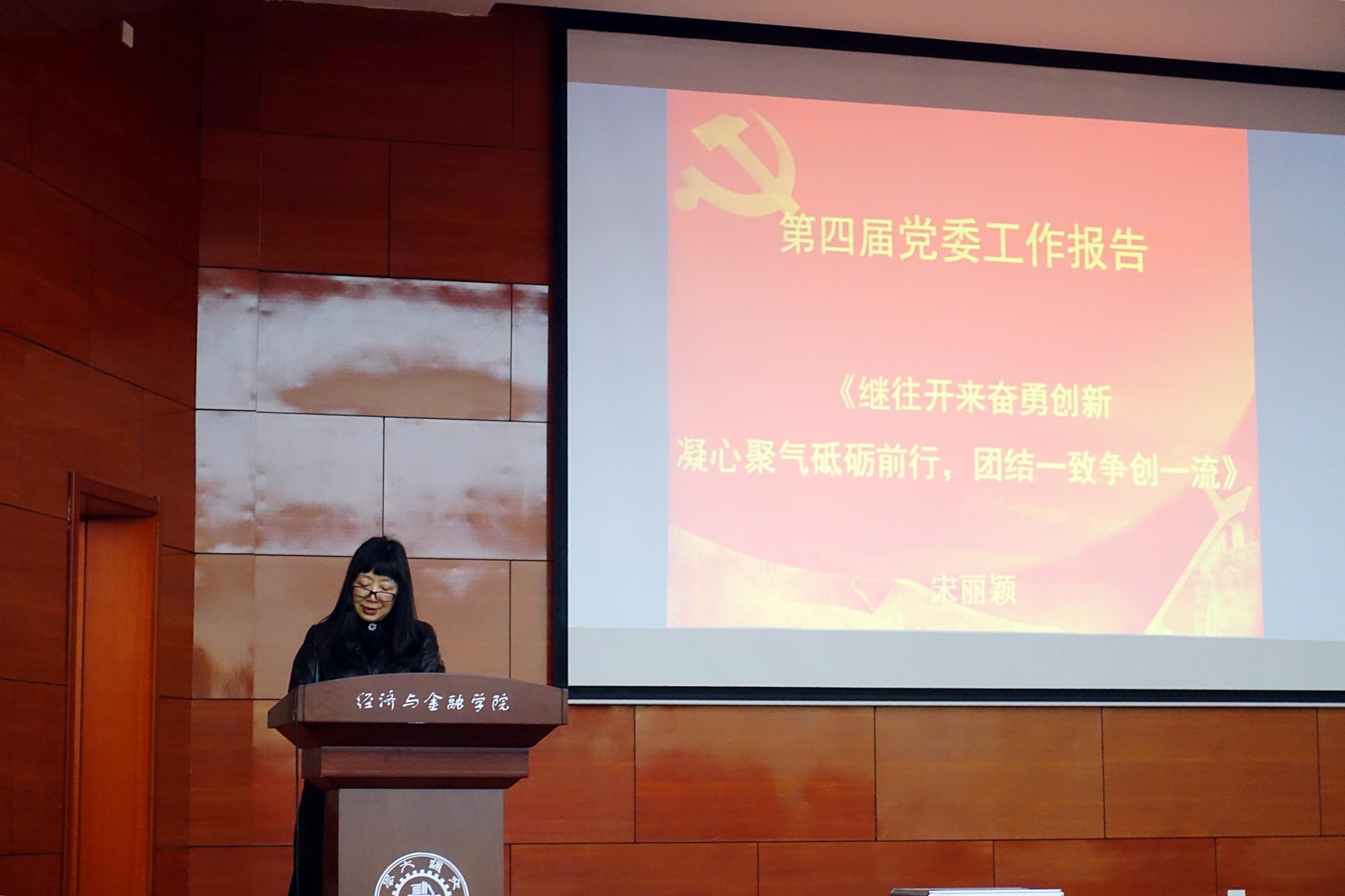 大会在庄严的国歌声中拉开了序幕,全体党员面向党旗重温入党誓词。经金学院党委书记宋丽颖同志代表学院第四届党委作了题为《继往开来奋勇创新,凝心聚气砥砺前行,团结一致争创一流》的工作报告,对学院第四次党代会以来的工作进行了回顾与总结,并对学院党委下一步工作提出了目标与展望。她强调,在学校“双一流”建设和创新港内涵建设的关键时期,要充分发挥基层党委的组织力,团结全院师生,抓住机遇、求真务实、开拓创新,奋力前行,进一步深化改革,迎接新挑战,创造新贡献,为建设一流经济学院努力奋斗。