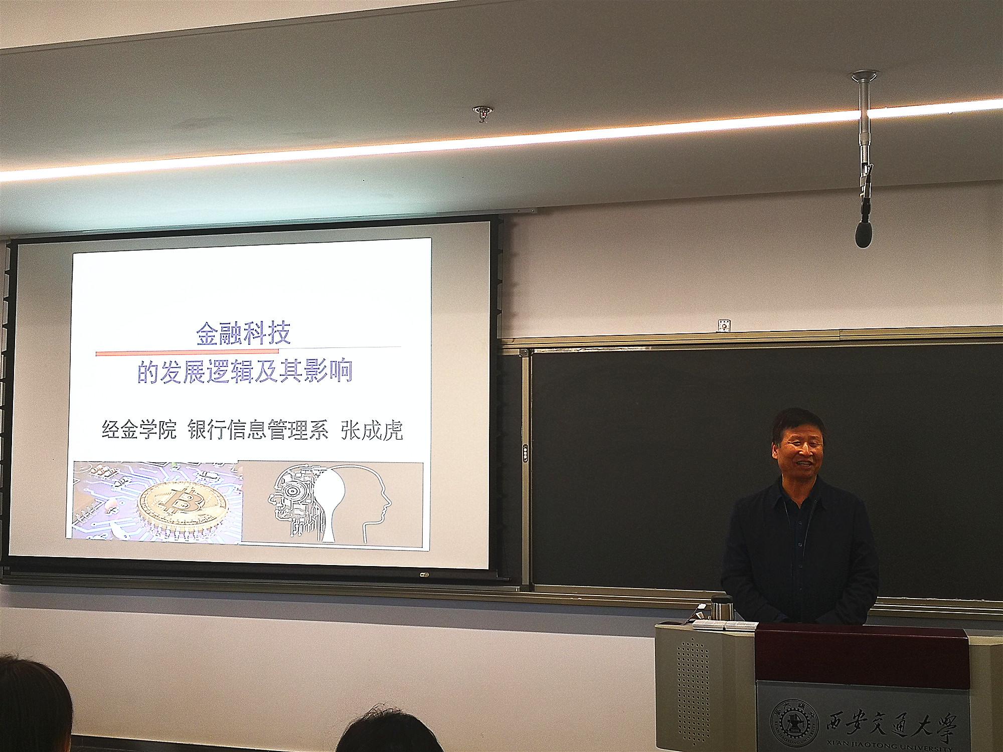 张成虎教授在报告中系统阐述了未来金融机构的发展趋势、金融科技的赋能逻辑、金融科技应用案例、关键技术、商业模式、银行业应对策略,并深入探讨了金融科技产生的逻辑影响。报告结束前,张教授与现场的师生进行了交流。