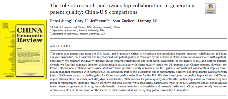副教授蒋仁爱在国际SSCI权威期刊《China Economic Review》发表了题为《The role of research and ownership collaboration in generating patent quality: China-U.S comparisons》的学术论文。
