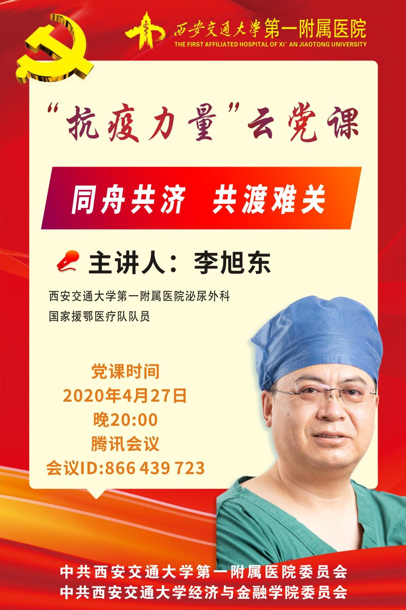为弘扬抗疫精神,传播正能量,加强党员理想信念教育,践行初心使命,激发广大党员同志的责任与担当意识。4月27日20:00,经金学院党委邀请了国家援鄂医疗队队员、交大第一附属医院李旭东老师讲授“抗疫力量”专题云党课,分享抗疫故事,共计80余名教工党员同志通过腾讯会议形式进行了讨论学习,会议由学院党委书记宋丽颖主持。