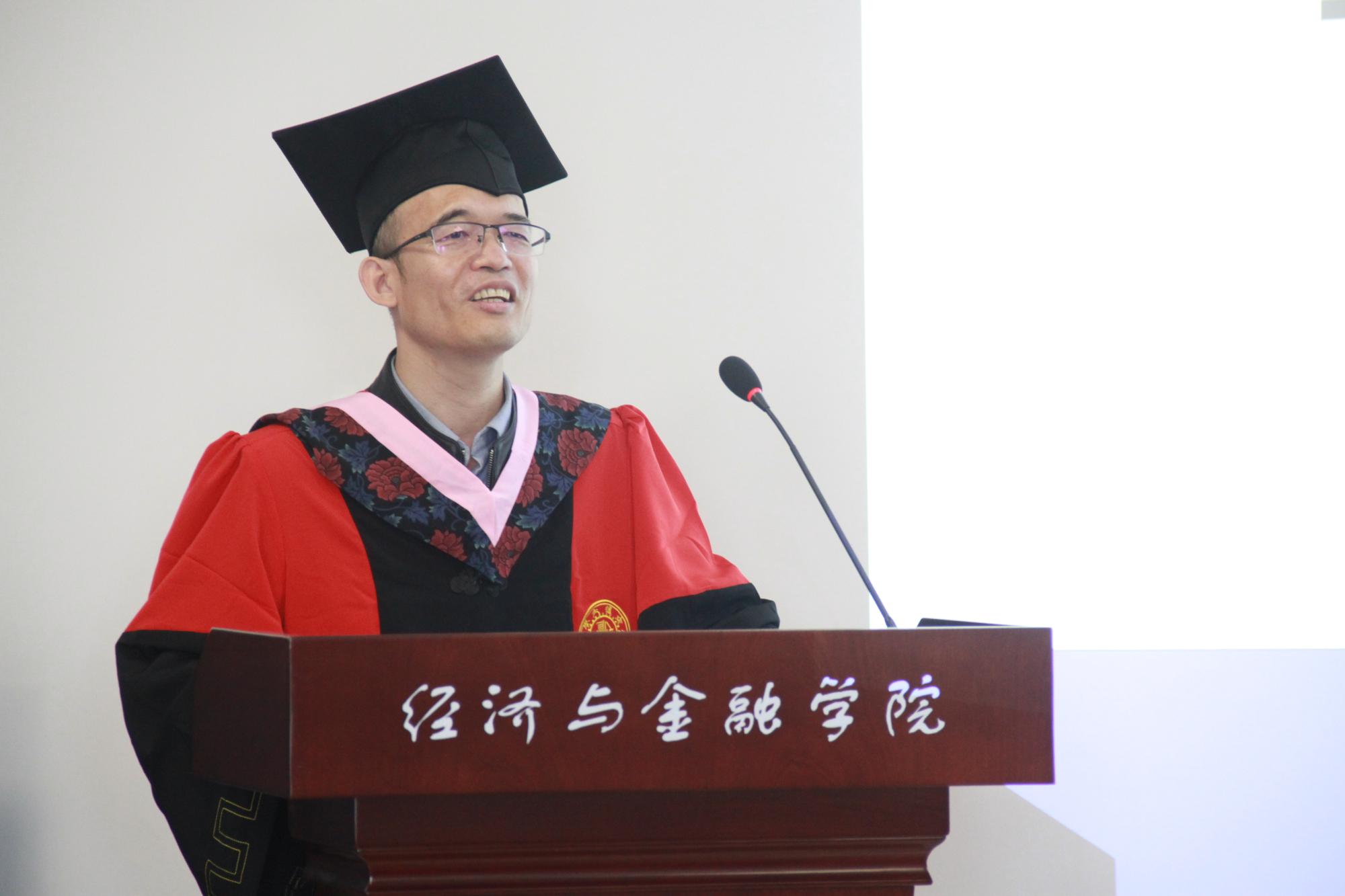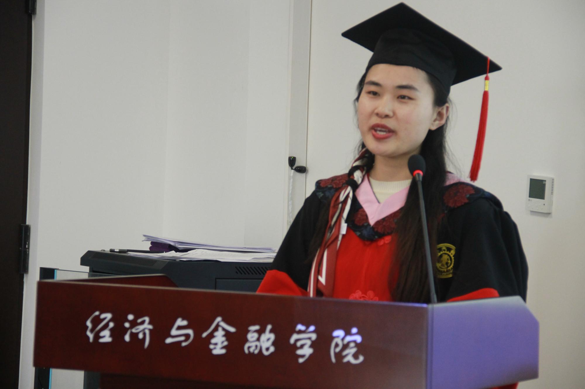 2015级博士生侯玉琳代表春季研究生毕业生发言。她向父母、老师、母校表示了由衷感谢,并细数了在经金学院求学时光所见证到的学院综合实力的迅速发展。“我们这代人,既是追梦者,拥有新时代给予我们施展才华的广阔舞台,也是圆梦人,肩负着时代赋予的伟大使命,我们要始终不忘初心,以青春之我、奋斗之我,为祖国建设添砖加瓦!”。