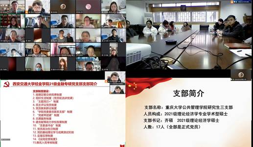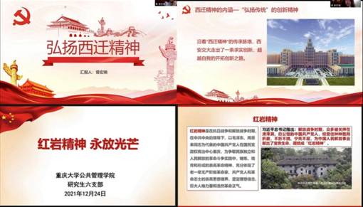 随后,经金学院金融专硕党支部宣传委员曾宏瑞、重庆大学公管学院研究生六支部书记何薇老师依次进行了关于西迁精神与红岩精神的党史学习教育专题宣讲。