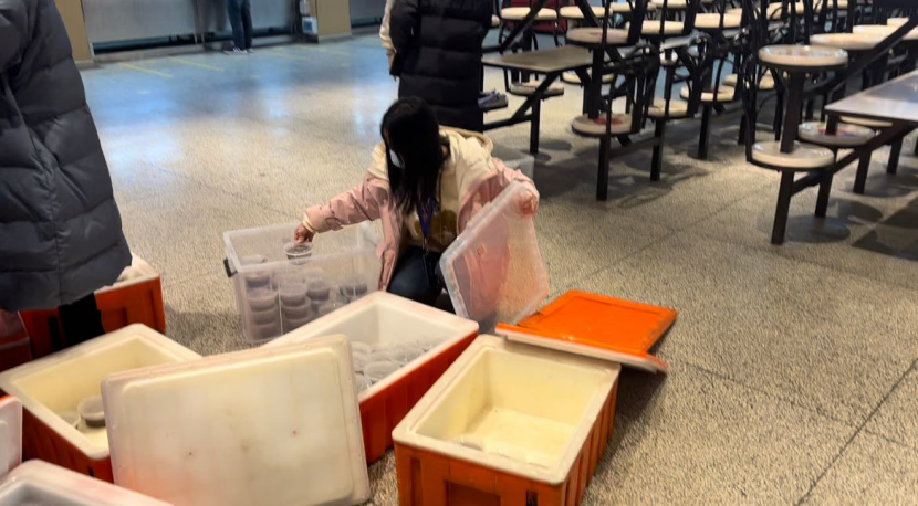 清晨7时45分,由硕1154党团支部10余名党员和入党积极分子组成的志愿服务队准时在财经食堂集合,在食堂工作人员和物业管理人员的帮助与指引下开始早餐配送工作。从分餐打包,数量清点,到餐食搬运、送餐上“门”,志愿服务队成员分工明确、认真负责,整个配送过程有条不紊,充分展现硕1154党团支部脚踏实地、恪尽职守的工作作风。经过紧张而有序的配送工作,8时30分许,各楼层各寝室早饭不漏一份、不漏一人全部送至封控同学手中。
