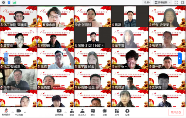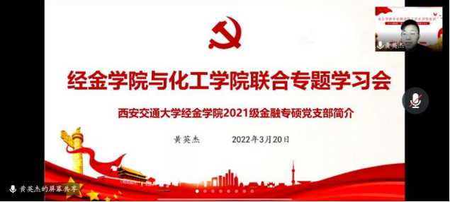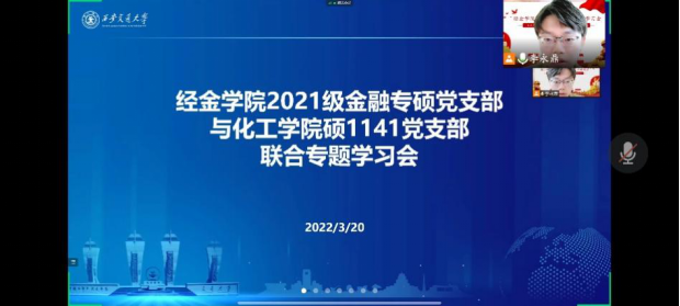 2022年工作要点》正式发布。“两会”热点问题和学校工作要点成为同学们关注的焦点问题。为深入学习“两会”精神及学校2022年工作要点,经金学院2021级金融专硕党支部与化工学院硕1141党支部联合开展支部专题学习会。会议由经金学院2021级金融专硕党支部书记李永鼎主持。经金学院副书记周建伦、化工学院副书记陶磊、化工学院辅导员强伟列席指导。