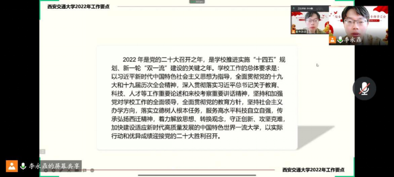 2022年工作要点》。他分别从坚持用习近平新时代中国特色社会主义思想铸魂育人、完善德智体美劳全面培养的育人体系、支撑高水平科技自立自强等十个方面,介绍了二十六个具体工作要点。基于以上分享,他呼吁同学们作为交大一员,除了重视科研学习,还应当放宽视野、提高站位,时刻关注学校发展。