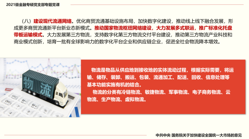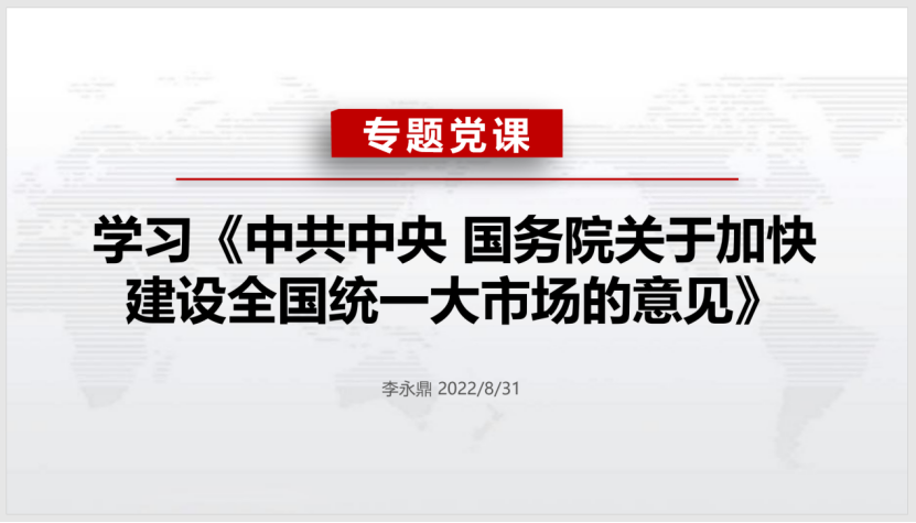 8月31日晚,经金学院2021级金融专硕党支部召开专题学习会,集体学习《中共中央 国务院关于加快建设全国统一大市场的意见》(以下简称《意见》),了解全国统一大市场的历史背景与政策方针。会议由支部副书记黄英杰主持,支部书记李永鼎讲专题党课,全体党员及入党积极分子参会。