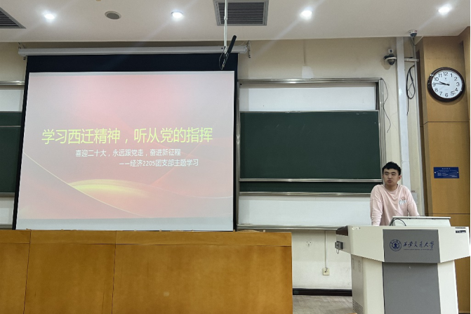 2022年9月25日,经济2205团支部在主楼B104召开了 “喜迎二十大,永远跟党走,奋进新征程”专题活动,团支部成员们认真学习了西迁精神以及党的十八大以来,党和国家事业取得的历史性成就。同学们了解了西迁教授们的伟大事迹,深刻认识到西迁精神的核心是爱国主义、精髓是听党指挥跟党走,通过专题学习,增强了同学们对西迁精神的深刻认知,以及对党的归属感和认同感。