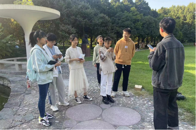 定向闯关的关卡设置着眼于传统文化,辅以趣味游戏的形式,闯关成功即可获得义卖物品。首先将全体成员随机分为两组,由钟兆琳先生的生平以及初阳亭名字的来历引出各组的集合地点--钟兆琳雕像和初阳亭,而后发布第一项任务:画出或写下你心目中的传统文化或者西安,引导同学们回忆传统文化内容。其次,由“莫愁湖边走,春光满枝头”和“胭脂坡上月如钩”引出任务二的地点,并在此进行关于城墙历史文化的快问快答,拓宽同学们对于古城墙的认识。最后,由“戎装学者交大掌门”和“野火烧不尽,春风吹又生”引出西花园和白居易东亭遗址,在此进行你画我猜,内容涉及皮影文化、大唐文化等,在欢声一片中增强了团支部凝聚力,也加深了同学们对于传统文化的理解。