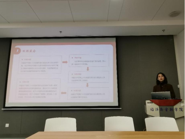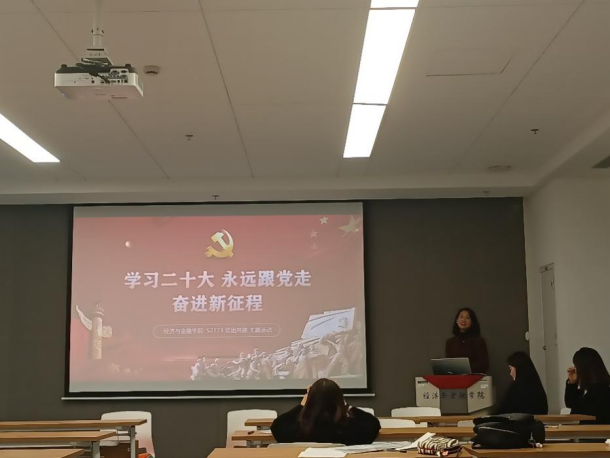 由于受疫情限制支部成员之间见面机会较少,为了尽快使大家熟悉起来,更好的开展学习,由党支部委员蔡嬴嫣组织开展破冰活动。破冰游戏环节过后,主持人潘雨霏带领支部成员们逐一回顾了党的二十大盛会。通过这部分的学习,同学们加深了对于二十大的认识,了解了党的二十大从召开到闭幕期间的流程安排及会议内容,更深刻地领悟了党的纪律性和先进性。