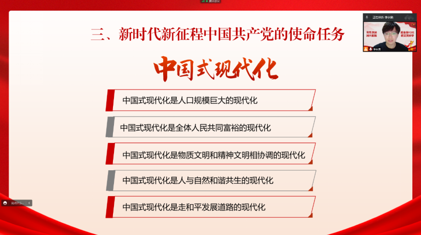 经金学院2021级金融专硕党支部书记李永鼎从党的二十大报告出发,全面深入地介绍了党的二十大报告的重点内容,对报告中十五个不同板块进行细致入微的解读分析,同学们收获颇丰。他提到,党的二十大报告是习近平新时代中国特色社会主义思想的精华浓缩,深刻阐述了一系列关系党和国家事业发展的重大理论和实践问题,提出了一系列重要思想、重要观点、重大战略、重大举措,对全面建设社会主义现代化国家、全面推进中华民族伟大复兴进行了战略谋划,对统筹推进“五位一体”总体布局、协调推进“四个全面”战略布局作出了全面部署,彰显了大党执政的定力魄力和大国复兴的志气骨气,是党团结带领全国各族人民夺取新时代中国特色社会主义新胜利的政治宣言和行动纲领。