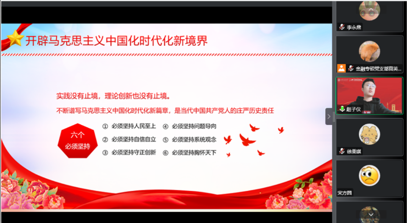 举世瞩目的中国共产党第二十次全国代表大会胜利闭幕,党的二十大精神在青年学子中引发了强烈反响。为深入学习宣传贯彻党的二十大精神,10月29日晚,经金学院2021级金融专硕党支部联合电气学院硕2065党支部开展了党的二十大精神专题学习会,电气学院辅导员柴冠坤、经金学院研究生事务员霍志远、支部全体党员和入党积极分子参加此次会议。