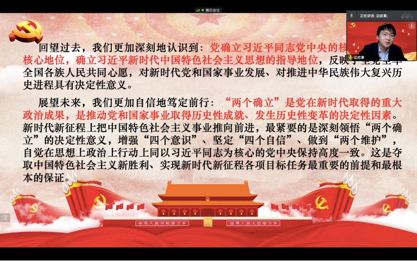 边启章以理论与实例相结合的形式,系统讲授了“两个确立”的重要意义。他强调,“两个确立”为我们提供了强大政治引领和科学理论指引,是战胜各种艰难险阻的最大底气,是推进党的自我革命的根本遵循,是创造新时代伟大成就的制胜密码,更是中国共产党、中国人民、中华民族走向更加辉煌未来的根本保证。新时代新征程上把中国特色社会主义事业推向前进,最紧要的是深刻领悟“两个确立”的决定性意义,增强“四个意识”、坚定“四个自信”、做到“两个维护”,自觉在思想上政治上行动上同以习近平同志为核心的党中央保持高度一致。这是夺取中国特色社会主义新胜利、实现新时代新征程各项目标任务最重要的前提和最根本的保证。