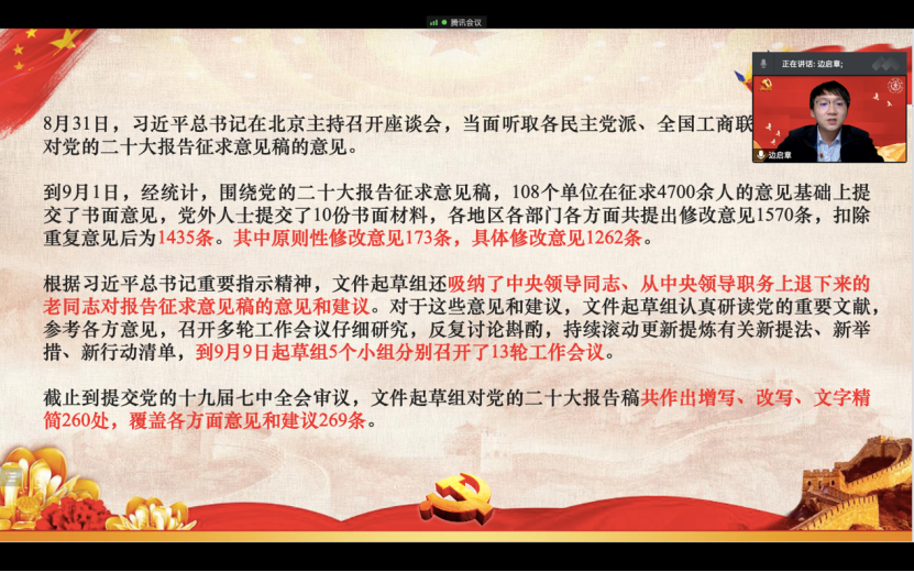 边启章指出,习近平总书记亲自担任党的二十大报告起草组组长,全程领导党的二十大报告起草工作,为报告的成功起草倾注了大量心血,发挥了决定性作用。党的二十大报告是充分发扬党内民主和全过程人民民主、集中全党全国人民智慧的结晶,必将对党团结带领人民全面建设社会主义现代化国家、全面推进中华民族伟大复兴产生重大而深远的影响,也必将有利于国际社会进一步了解中国共产党的执政理念、执政方式、执政能力。