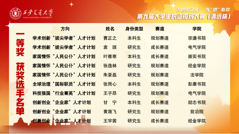 赛道“人民公仆”人才计划一等奖获得者张逸林,他规划的目标职业为基层公务员,他说自18年入校以来,在浓厚家国情怀的熏陶下,胸怀大局,无私奉献的西迁精神给他留下极其深刻的印象,这促使他在校期间尽可能多的去尝试不同的学生工作与志愿活动。他希望通过定向选调的方式,成为西部省份的一名基层公务员,将青春绽放在这片曾求学七载的厚重土地上,将自身价值的实现融入到服务人民、建设西部这样宏伟的时代目标中去。
