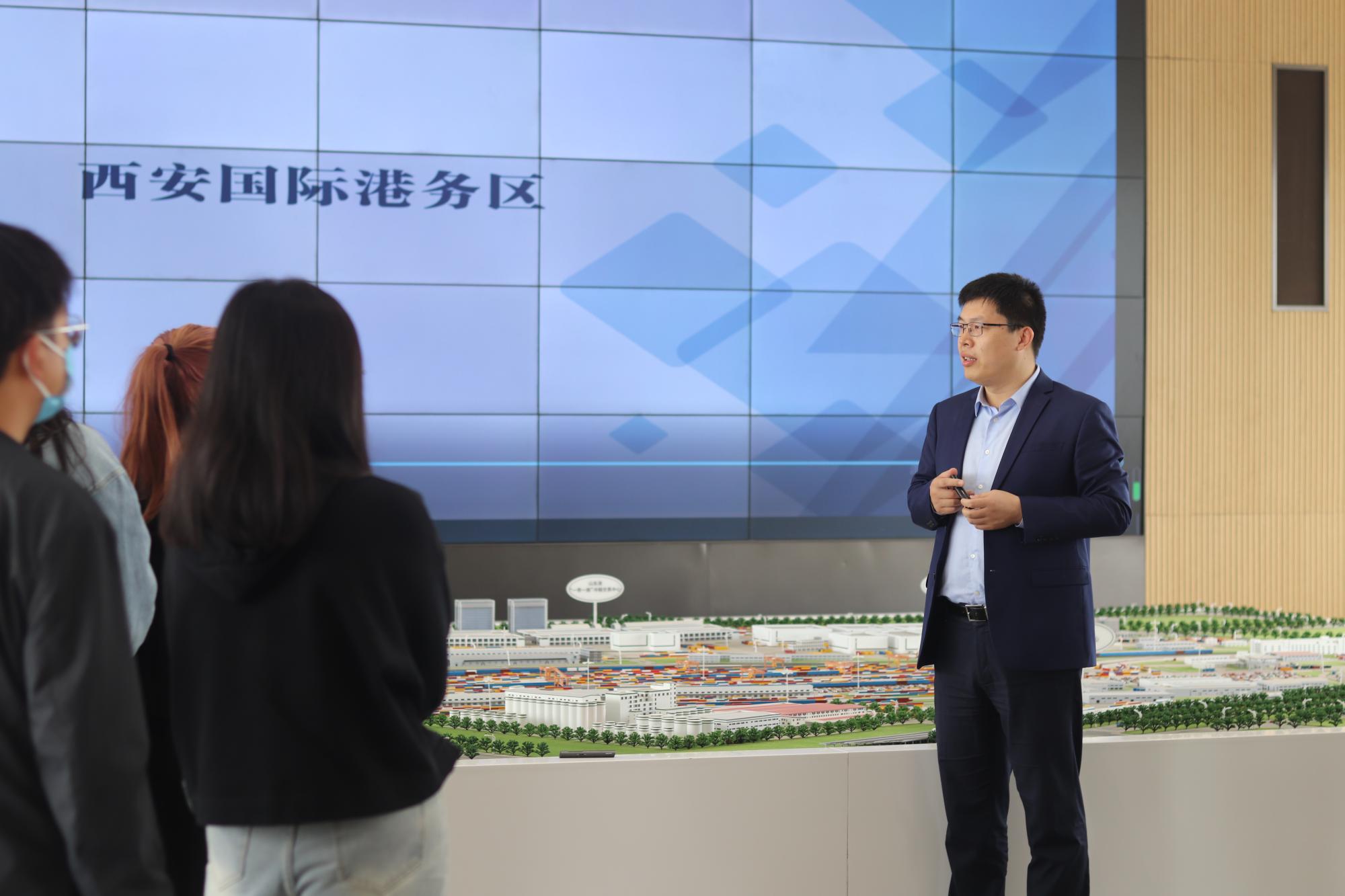 在西安铁路集装箱中心站,西安自贸港建设运营有限公司总经理袁小军通过宣传短片以及模拟模型,向同学们生动介绍了中欧班列西安集结中心的功能分布和建设运营情况,尤其是中欧班列(长安)号的运营现状以及班列在推动陕西深度融入共建“一带一路”中的重要作用。随后,同学们实地参观了中铁联集西安中心站的布局,真实感受了内陆港设立的重大意义以及中欧班列在联通中国与世界中的桥梁与纽带作用。