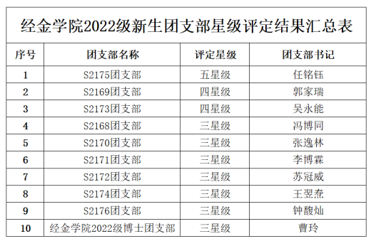 为深入贯彻党的二十大精神,加强共青团基层组织建设,提升团组织内部凝聚力与创造力,根据校团委工作安排,经金学院团委于2023年4月对2022级研究生新生团支部组织进行了星级评定推荐工作。经团支部自评、学院复评和校级终评,2022级研究生新生团支部在校级星级评定中获得好成绩,S2175团支部被评为“五星级”团支部,S2169和S2173团支部被评为“四星级”团支部。