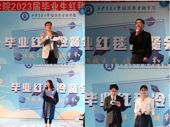 红毯秀暨冷餐会伊始,周建伦书记发表致辞,他对2023届毕业生顺利完成学业表示祝贺,对培养学生辛勤付出的老师们表示衷心的感谢!希望同学们永远紧跟时代步伐,始终保持对新领域、新事物、新思想、新技术的好奇心,努力成为引领时代发展、文明进步的奋斗者,并祝愿毕业生前程似锦,常回来看看。教师代表李江龙老师嘱咐大家毕业后将会面临全新的机遇和挑战,希望大家继续保持科研精神,勇敢地面对挑战。省级优秀毕业生代表马瑞回顾入校九年来,在学校、学院老师们的关怀培养下不断成长,最终在交大留下了一个属于交大人的“胸怀大局无私奉献弘扬传统艰苦创业”的印记,并深深表达了对学院和导师的感谢,她表示自己定会牢记嘱托,让青春在奋斗中绽放绚丽之花。