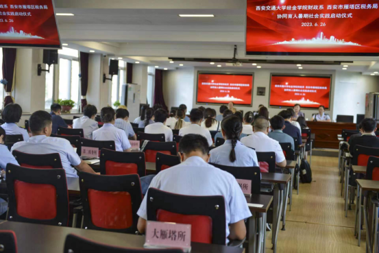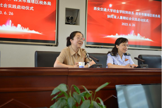 财政系主任王俊霞教授首先感谢西安市雁塔区税务局几十年来对财政系的支持,对学生社会实践活动始终高度重视,精心安排,为学生提供了良好的实习环境和条件,对学生关怀备至,像对待亲人一样对待学生,使学生不仅收获了知识,收获了友情,增加了就业筹码,为学生走向社会前上了一堂生动的教育课。其次,王老师对参加实习的学生提出了几点期望和要求:一要谦虚谨慎,虚心好学,认真向税务局的老师学习;二发扬交大西迁精神,不怕苦、不怕累,吃苦耐劳,勇挑重担,为交大争光;三严格遵守实习单位各项规章制度和作息时间;四注意人身和财务安全,做好个人防护。祝愿同学们在雁塔区税务局度过一个愉快的、有意义的、收获满满的暑期实习生活。