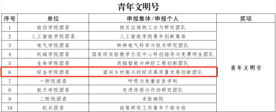 青年文明号、青年岗位能手评选活动顺利落幕。经过激烈的层层选拔,我院李聪老师带领的“面向乡村振兴的经济高质量发展创新团队”荣获“青年文明号”称号,李江龙老师荣获“青年岗位能手”称号。