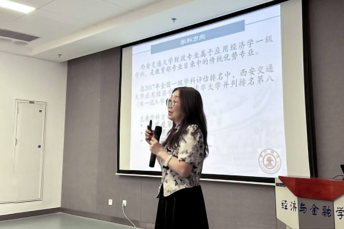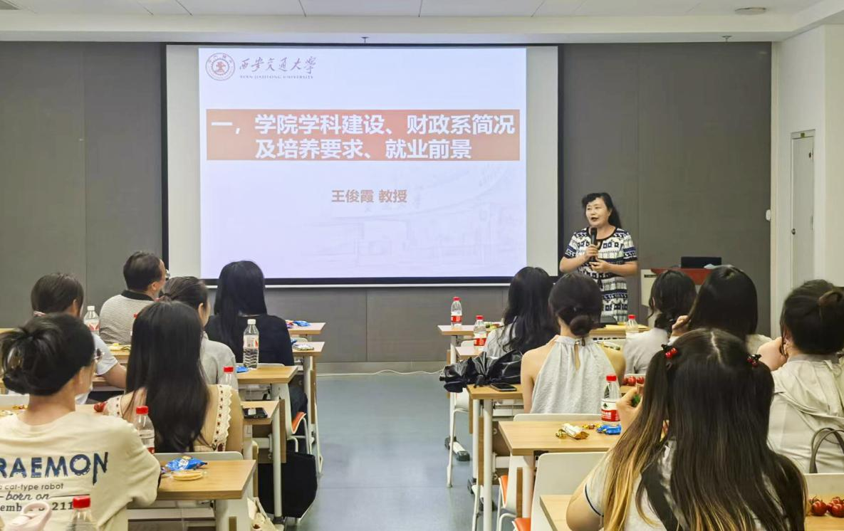 财政学科带头人宋丽颖教授向师生们介绍了目前财政税收学科发展情况、我国财政与税收发展的历史、当代中国财政税收制度发展现状,对财政学硕及博士研究生的培养要求进行了详细介绍,同时也介绍了财政系的杰出校友,鼓励同学们认真学习前沿知识、努力开展科学研究、积极投身社会实践,在交大这个大平台上取得更好的成果。
