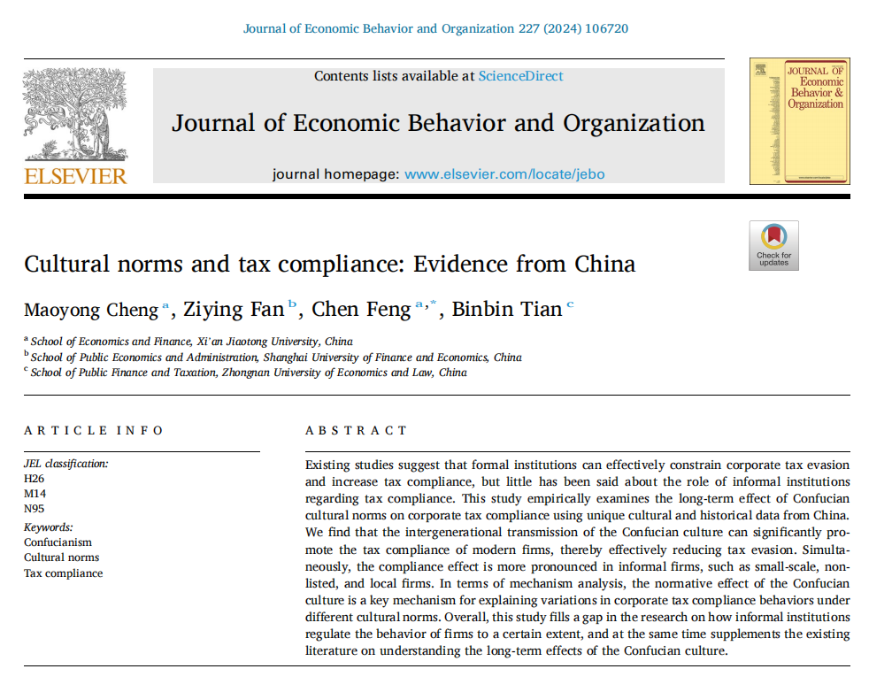 针对以上问题,近日,经金学院程茂勇教授、冯晨教授及合作者上海财经大学范子英教授、中南财经政法大学田彬彬教授(作者顺序按音序排列)的研究成果“Cultural norms and tax compliance: Evidence from China”,基于我国四川省独特的土司制和郡县制的历史分布场景,着重关注了以儒家文化为代表的文化规范性约束对于企业纳税遵从行为的长期影响。研究结果发现,儒家文化的代际传承能够显著促进当代企业的税收遵从行为。同时,纳税遵从效应在小规模企业、非上市企业、本地企业等表现得更加明显。就作用机制来看,这种规范性约束正是解释不同文化特征下企业纳税遵从行为差异的重要机制。总体来说,该研究在一定程度上补充了关于非正式制度如何规范企业行为的相关研究进展,以更好地理解儒家文化的长期影响。上述研究成果目前在行为与组织经济学旗舰期刊Journal of Economic Behavior & Organization(JEBO)上正式发表。