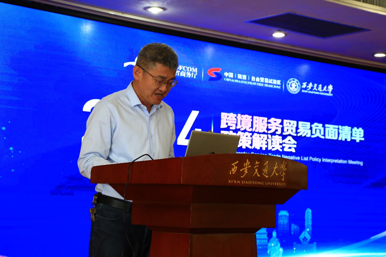 对省商务厅长期以来对学校的大力支持表示衷心的感谢。他指出,全国版和自贸试验区版跨境服务贸易负面清单首次实现了服务贸易4种模式负面清单全覆盖,对于推动服务贸易创新发展、加快实施自贸试验区提升战略具有重要意义。他期望此次政策解读会深度理解服务贸易和服务业开放的核心要义,在实践中注重从边境向边境内措施延伸、从局部试点向全方位改革推进、从碎片化向系统性转变、从适应追赶规则向对接引领规则转变,为国家探索出更多的陕西经验。