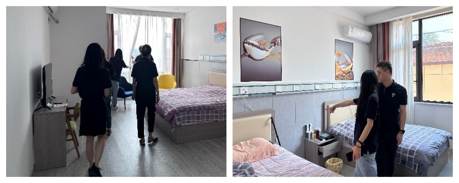 座谈结束后,同学们跟随负责人汪院长参观了中心的各项设施。中心内设有宽敞明亮的休息室,配有双人间、单人间、套间等120个床位及70张护理床位,此外还设有图书馆、健身房和多功能活动室,以满足老人们生活娱乐的不同需求。房间里各处都设有辅助扶手、防滑地砖等设施,为老人们的生活提供便利的同时,更多了一份安全保障,引得同学们连连点头、交口称赞。在探访过程中,同学们对养老院的医疗服务尤为关注,他们了解到,养老中心与西安国际医学深度合作,为老人们提供24小时医疗服务。中心还设有种植园,保证了新鲜、优质食材的供应,也衍生出了丰富多样的采摘项目。此外,养老院还提供子女探望住宿服务,配备了齐全的家具和生活用品,让老人们在享受高品质养老服务的同时,也能享受到阖家团圆的温馨。一系列的配套服务让同学们对养老产业外延式产业创新有了更深刻的理解。