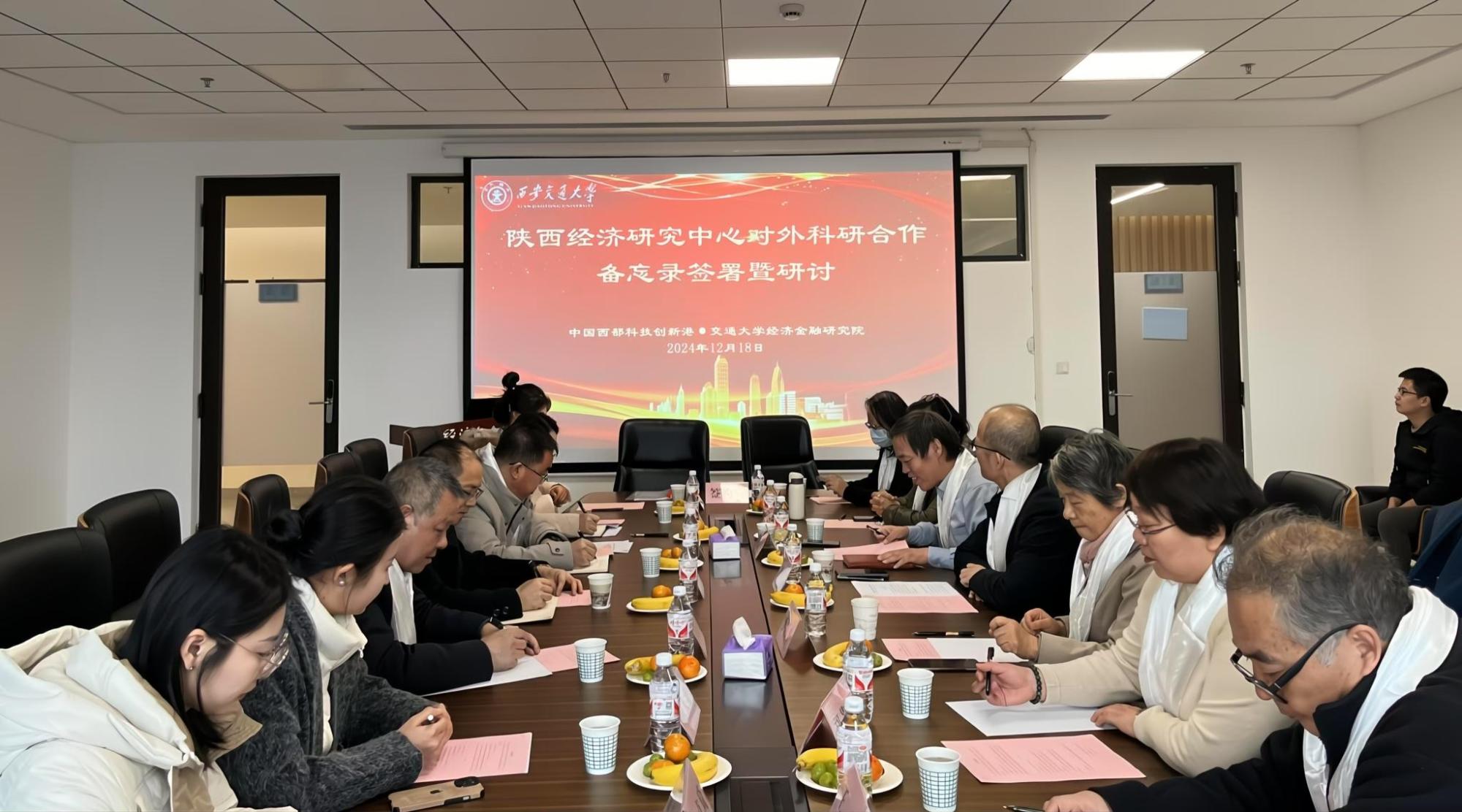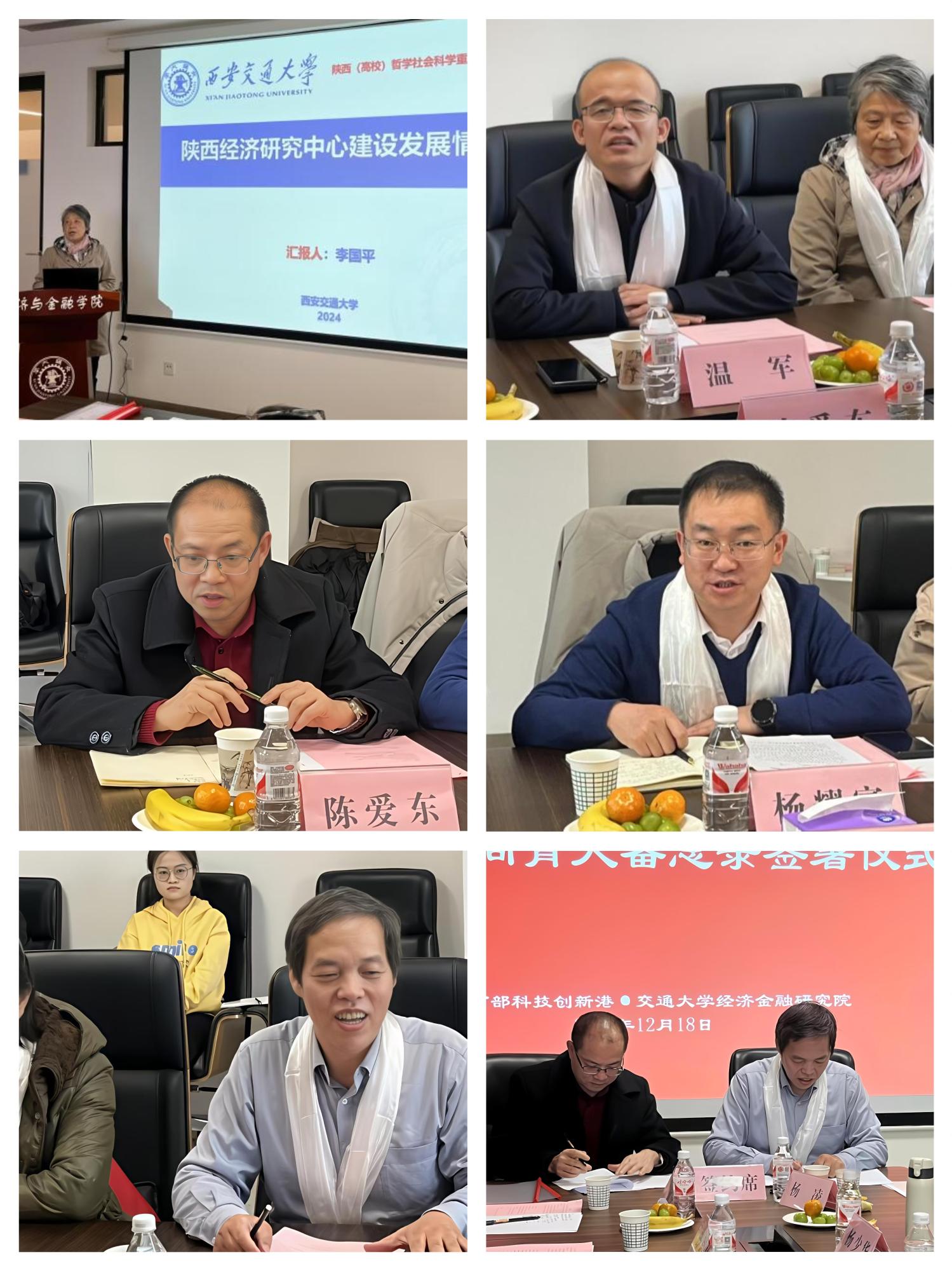 陕西经济研究中心(以下称“中心”)与西藏民族大学财经学院、陕西省投资和贸易促进中心科研合作备忘录签约仪式暨合作研讨在创新港举行。西藏民族大学财经学院院长陈爱东教授,陕西省投资和贸易促进中心负责人杨耀富、主管孙思佳,陕西省统计科学研究所(合作单位)二级调研员郭秦川,经金学院副院长温军教授,中心名誉主任李国平教授和中心研究人员、研究生等20多人参加了签约仪式和研讨。此次活动由中心主任王育宝教授主持。