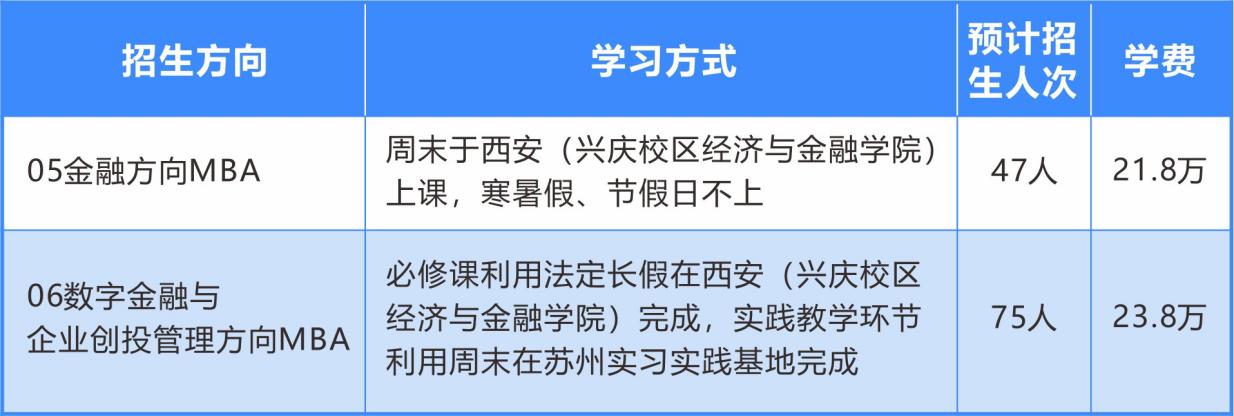 计划面向全国招收工商管理硕士学位研究生(非全日制MBA)。其中,金融方向MBA(方向代码05)计划招生47人,数字金融与企业创投管理方向MBA(方向代码06)计划招生75人。