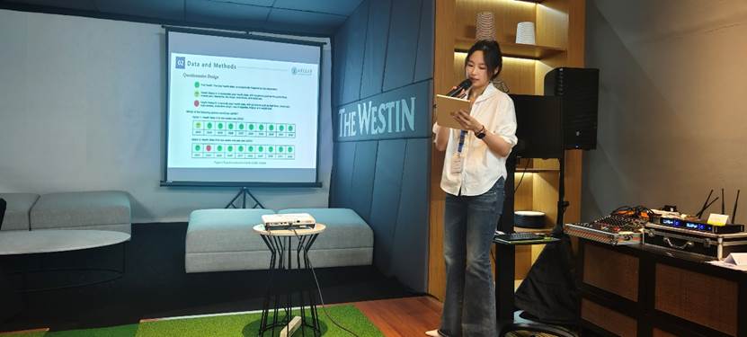 硕博研究生也在大会上积极展示各自的研究成果。博士生陈丹蕾的两项研究“Effectiveness of Direct and Indirect Time Preference Elicitation Methods Across Domains in Predicting Health Behaviors: Evidence from Rural China”与“Gender Differences in Time Preferences Across Health and Financial Domains: Do Elicitation Approaches Matter?”分别由吴静娴副教授和博士生刘琦琦代为汇报,研究围绕时间偏好在健康行为预测中的作用,以及性别差异与测量方法的影响,深入探讨了时间偏好测量在不同领域的适用性;博士生刘琦琦聚焦于健康领域时间偏好的测量一致性与应用实践,分别作题为“Time Preference in the Health Domain Among Rural Adults in China”与“In Search of a Preferred Time Preference Elicitation Method in the Health Domain Testing the Consistency Between Direct and Indirect Approaches”的汇报;硕士生邓亚萍围绕家庭灾难性卫生支出,分别以“Socioeconomic Inequalities in Financial Risk Protection in China: An Evaluation of Universal Coverage of Social Health Insurance”与“Trends in the Incidence and Intensity of Catastrophic Health Expenditure in Urban and Rural China: 2010–2022”为题作报告,系统分析了中国城乡家庭卫生支出风险趋势及其背后的社会经济不平等问题,具有重要的现实意义和政策启示;硕士生仝坤鹭则作了题为“Income-Related Inequalities in Chronic Pain Among Middle-Aged and Older Chinese Adults: A Population-Based Cross-Sectional Study”的报告,聚焦中老年人群慢性疼痛的收入相关不平等问题,揭示了健康结果中潜在的社会分层影响,呼吁更多关注弱势人群的健康状况。
