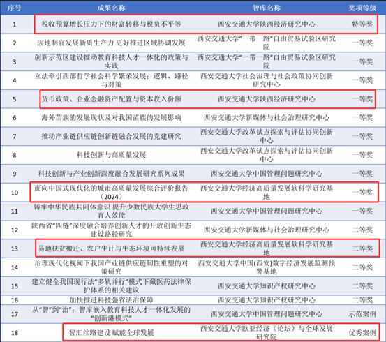 学院智库“陕西经济研究中心”入选CTTI2025年度高校智库百强榜A智库,两项成果分别荣获特等奖及一等奖。学院智库“经济高质量发展软科学研究基地”两项成果分别荣获一等奖及二等奖。学院智库“欧亚经济(论坛)与全球发展研究院”一项成果荣获优秀案例。