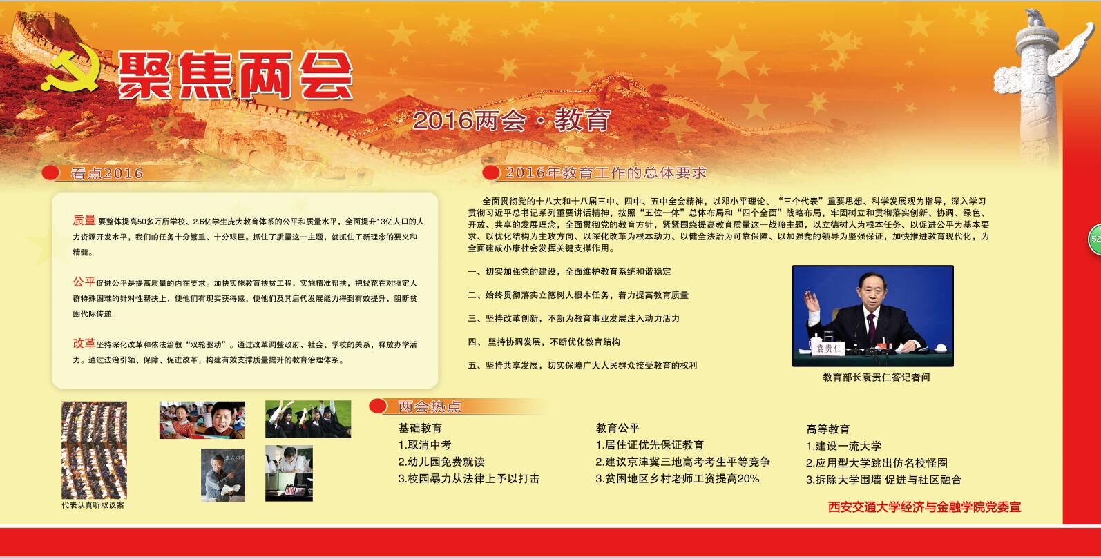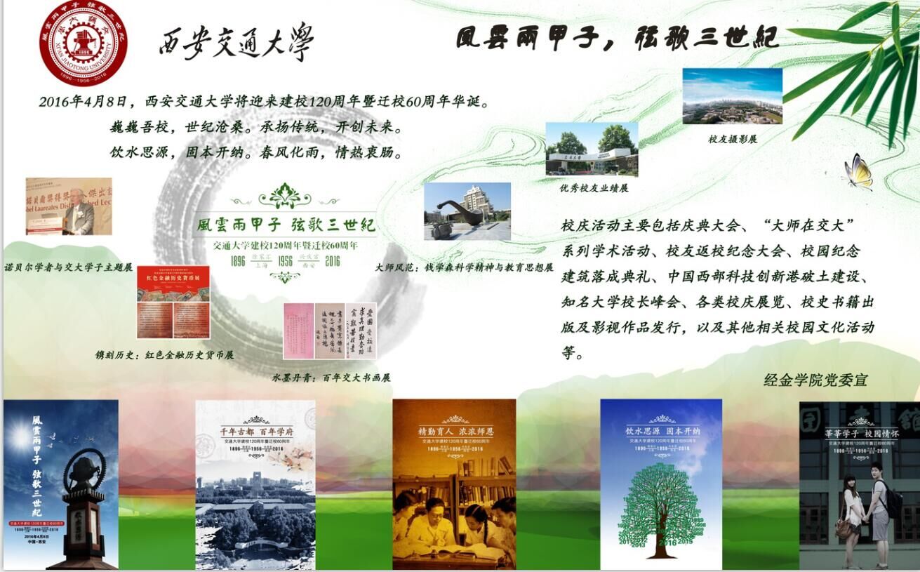 为迎接学校“双甲子”校庆,展现优美的校园环境,积极宣传学校及学院活动,营造良好的校庆氛围,学院集中对财经主楼周围宣传栏进行更换。宣传内容既体现了我院历史和各项工作的实力,又昭示了“大经金”灿烂辉煌的未来。