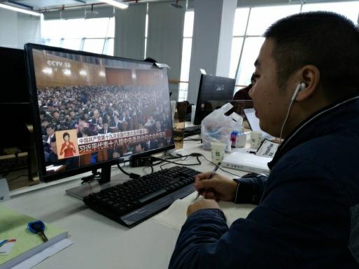 硕7142党支部书记杨楠正利用课间的休息时间在教室和周围同学一起收看十九大开幕式,“我刚听到总书记讲全面从严治党这块,感受到我们党自我革新、自我净化的巨大力量,课间时间较短,后面还会组织党支部的同学一起回看学习”。