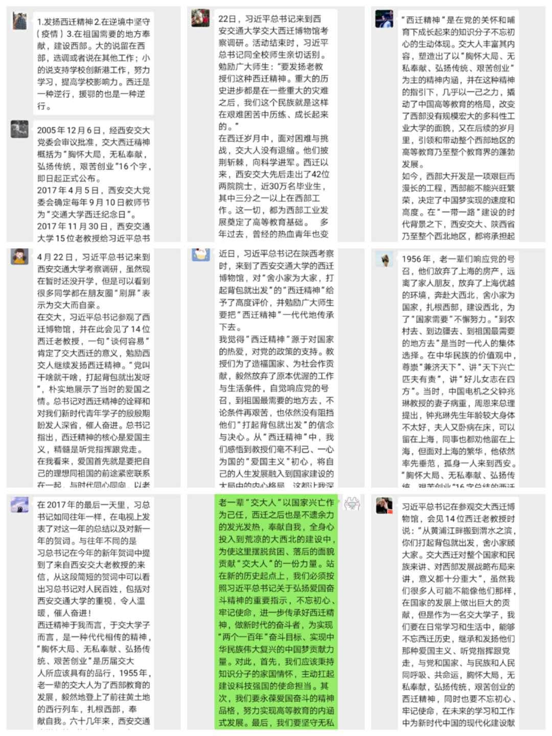西迁博物馆后的讲话发表了自己的学习心得。曹一凡同志强调西迁精神的内涵是爱国精神,我们作为新时代的交大人要把自己的理想与祖国的前途紧密联系在一起。刘笑初同志结合中特课程讲述了对于西迁老教授们敬业爱岗的西迁精神的崇敬以及赞美。邵凯与于虎同志说要爱党爱国,增强“四个自信”,坚持“四个意识”和“两个维护”,在新时代发扬西迁精神。李珂与余静同志认为要全心全意为人民服务,为国家、社会无私奉献自己的力量。柯智健、戚东同志说要不忘初心,牢记使命,不忘西迁精神,在新时代新背景下传承和发展西迁精神。郭薛南、张悦和苏嘉仪同志表示要将自己的命运与国家的命运结合在一起,作为国家作出贡献,与祖国人民同呼吸共命运,作为交大人要发扬西迁精神,建设大西北。龚思淼和白露同志都提到要在祖国最需要的地方作出贡献,作为创新港人,我们也是新西迁人,更要为创新港的建设作出贡献,向西迁老前辈学习。同时白露同志将西迁与抗疫相类比,表示西迁是逆行,抗疫也是逆行,而我们也要向这些逆行的人致敬学习。彭丽颖和司锦同志强调一代人有一代人的使命图与担当,我们作为交大人要承担起自己的使命,努力宣传、发扬西迁精神。