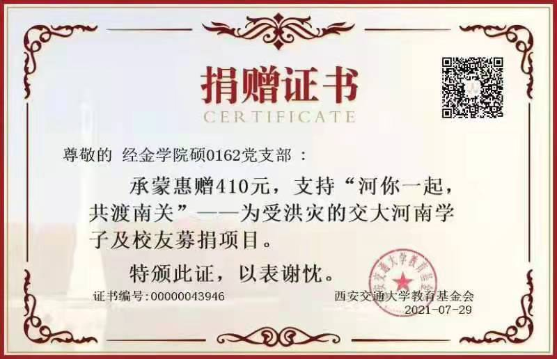 贺敬茹同志说:近日,河南等地持续遭遇强降雨,郑州等城市发生严重内涝,造成重大人员伤亡和财产损失。中共中央总书记、国家主席、中央军委主席习近平对防汛救灾工作作出重要指示,要求始终把保障人民群众生命财产安全放在第一位,抓细抓实各项防汛救灾措施。一方有难,八方支援,大雨无情,人间有爱。小城大爱,温暖常在,硕0162党支部全体成员一起为河南加油,奉献自己的一片爱心!