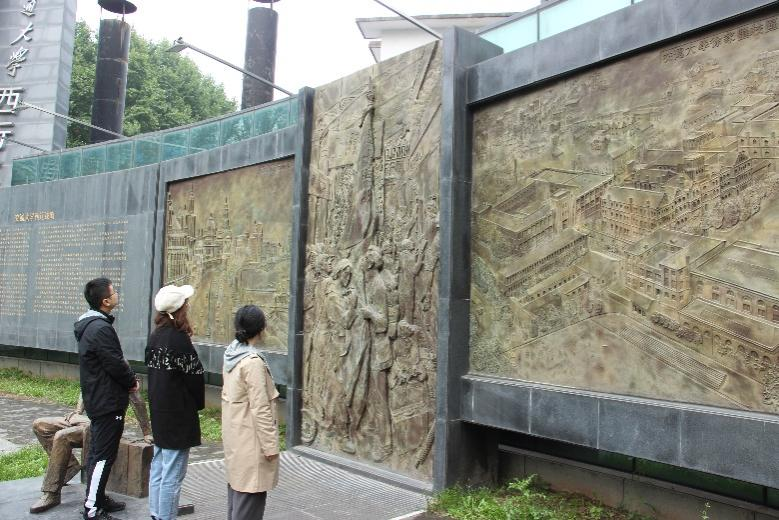 第一组同学负责探寻的是“西行之履”和“南洋公学牌楼”。孙圣仪、刁宇等7位同学在本科就读于数学学院的蒋铮宇的带领下,顺利找到了位于学校西北角的两个地标。同学们仔细阅读了“西行之履”的碑文,了解到旁边浮雕背后的故事:1956年8月10日,上千名交大教职工、家属和学生登上开往西安的专列,向繁华的大上海挥手告别。临行前,上海其它高校师生纷纷闻讯赶来送别,复旦大学、同济大学等高校师生将校徽取下来别在校旗上给交大师生留作纪念。
