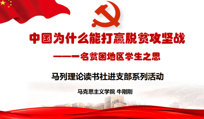 的党建工作中具有鲜明的积极性。马克思主义学院硕0124团支部书记杨心怡介绍其所在支部的情况,认为此次活动为硕0124团支部提供了一个很好的学习机会。随后,马列读书社学习部成员牛刚刚同学以《中国为什么能打赢脱贫攻坚战——一名贫困地区学生之思》为主题进行宣讲。牛刚刚同学从《贫穷的本质》出发在理论层面介绍贫困产生的原因,从历史的逻辑出发分析中国脱贫攻坚的具体阶段,以其大学时在湖南十八洞村、陕西郝家桥村的调研为依据,具体分析国家“精准扶贫”战略的开展,在上述基础上,从现实层面论述中国为什么能够打赢脱贫攻坚战并总结出了十条经验。