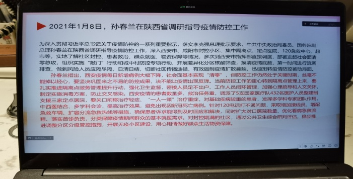 之后,支部同学一同学习领会了孙春兰总理三赴西安指导疫情防控工作强调内容,感受到党中央、国务院对西安人民的关心与牵挂。号召党员同学们发挥党员先进性,引导广大同学积极响应防控政策,巩固当前疫情防控取得的胜利,为最后的完全胜利助力。