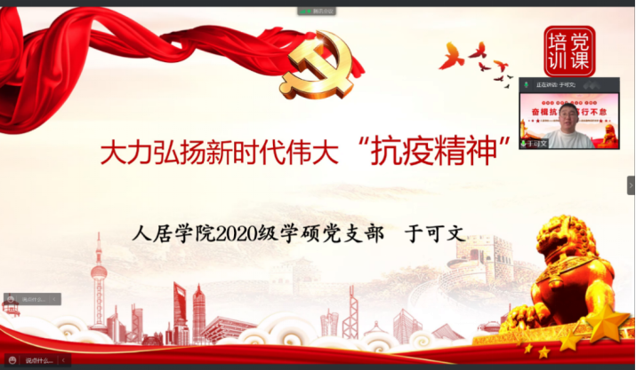 人居学院2020级学硕党支部书记于可文从伟大抗疫精神的历史传承、丰富内涵、历史意义和现实意义带领大家充分学习和领悟了伟大抗疫精神。于可文号召广大党员要大力弘扬伟大抗疫精神,坚定斗争意志,以越是艰险越向前的气魄奋勇搏击,一起携手打赢疫情防控阻击战。