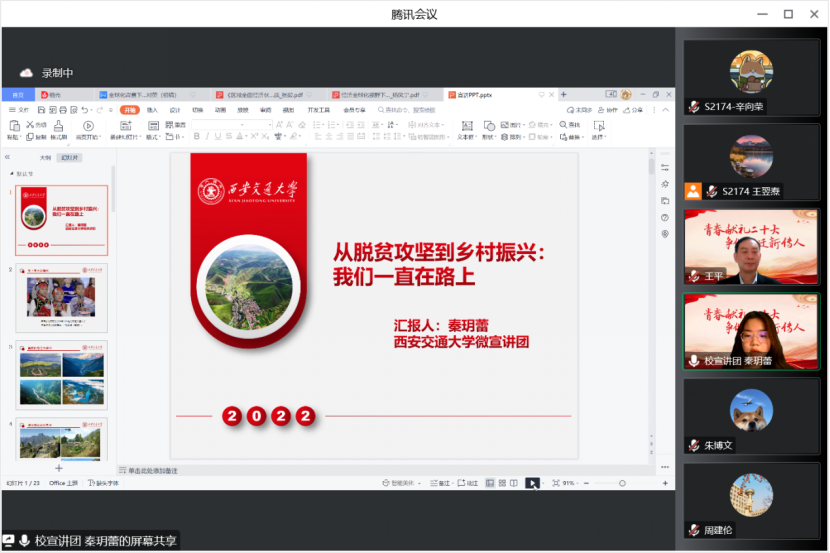 硕2174班党支部书记袁梦琪带来专题分享——《新时代“西迁精神”再出发》。阐述了西迁精神的内涵以及西迁精神在新时代的体现。她表示,西迁精神并没有成为过去式,而是作为共产党人的精神谱系代代相传。作为新一代的交大学子,更应该踔厉奋发、笃行不怠,争做西迁精神新传人。