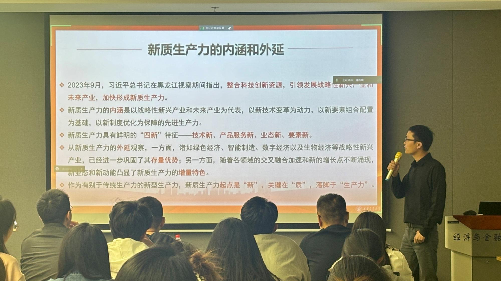学有所得,筑牢思想桩基。理论培训部分紧紧围绕党的实践理论、党内法规和党的基本知识并结合学院专业实际开展系统培训。先后邀请了马克思主义学院副教授刘源老师、经金学院教授李江龙老师、党委组织员董娜老师以及辅导员王平老师为同学们开展专题授课。刘源老师以《毛泽东调查研究的理论和实践》为主题,强调“没有调查,就没有发言权”,敦促学生们科研工作一定要坚持实事求是的原则,善于调查研究,勇于实践创新。李江龙老师结合经济学专业实际,以《新质生产力与碳中和目标》为主题,与学生们探讨了新质生产力与碳中和目标之间的内在联系,帮助学生们深化了对新质生产力及碳中和目标的理解。董娜老师和王平老师则是着眼青年党员以及高校基层党组织,开展了党性教育和党务教育,推动党的理论入脑入心,教育引导学生们提高思想觉悟,端正入党动机,真正为新发展党员系好了成长进步的“第一粒扣子”,为发展对象上好了入党“修身课”。