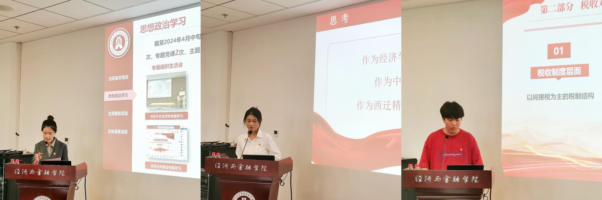 离退休党委委员、财经校区第七支部书记王文博教授介绍了离退休党支部的基本状况、组织建设及活动开展情况,展现了老党员们不忘初心、砥砺前行的精神面貌。研究生党支书代表李秋漪则分享了研究生党支部在思想引领、组织建设、实践活动等方面的经验和做法凸显了新时代研究生的责任与担当。