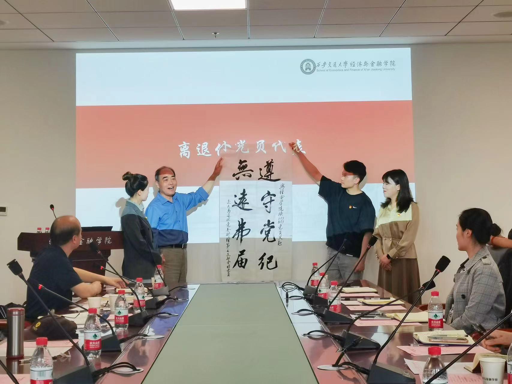 交流环节结束后,离退休党支部向研究生党支部赠送了一幅内容为“遵守党纪,无远弗届”的书法作品,以此激励研究生党员们在党纪学习教育中,加强党纪学习、增强规矩意识,扣好人生的第一粒扣子,为党和人民的事业不懈奋斗。