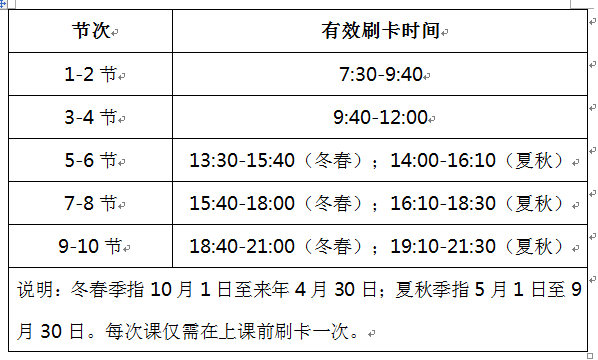1、电子考勤系统中考勤信息分为4种状态:“正常”、“迟到”、“请假”、“旷课”(未刷卡或未在有效时间内刷卡为“旷课”)。学生上课持校园卡在电子班牌或者电子考勤机上刷卡考勤。电子考勤以课表上每次连续的上课时段为单元,有效刷卡时间为: