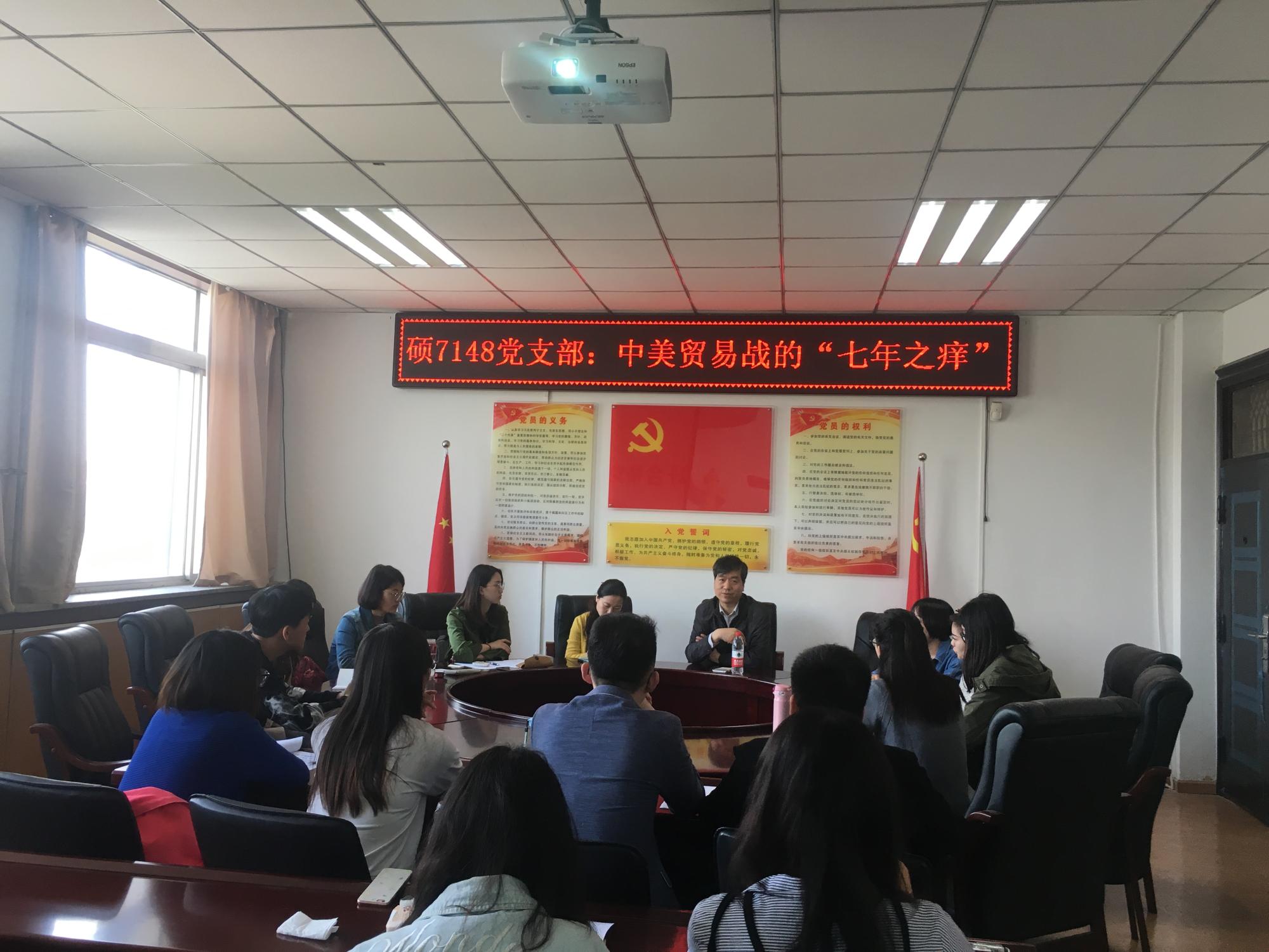 首先,硕7148党支部书记马俊洁同学对中美贸易战的过程进行了一个详细的介绍,并引发对贸易战的思考。各位党员就此展开了激烈的讨论。张鑫泽同志认为美国对中国开展贸易战的原因主要包含以下几点:实现特朗普在先前选举时的承诺,即对中方采取强硬措施;新组建的内阁偏鹰派,包括贸易办公室委员等对中国的态度比较偏激;特朗普中期选举情况不理想,意在讨好共和党。同时,他也认为中美贸易战目前还在磋商阶段,并没有到剑拔弩张的地步。刘雨生同志从技术贸易逆差的角度提出了自己的想法,他认为中美贸易战从技术贸易逆差的角度来看,在当今阶段过程中中国仍然处在全球产业链中附加值十分低的部分,而美国仍处于产品设计和营销的高附加值部分。在美国本次签署的贸易关税合同中,美国对于中国未来重点发展的高新技术产品,通信产品等进行了贸易限制,其目的更多的是保持美国在技术贸易上的顺差,对中国经济的复苏进行遏制。